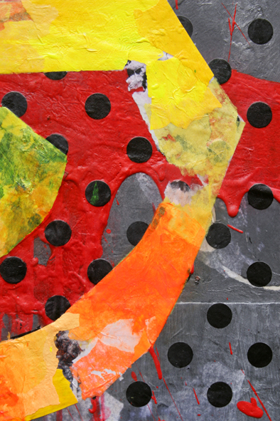The ‘K’ panel is pure invention and lacks any specific visual reference. I wanted to suggest the creep of fire and smoke across the panel whilst forming a visual stop to the quartet’s overall composition. The implication might be equally of ultimate incineration resulting from communal sickness or of cleansing fire. It was achieved by attacking layers of paper and paint with a heat gun, to the point of combusting the panel itself. The remaining portion features a faux crackled paint effect implying the effects of heat, and poster fragments to reinforce the idea of cultural collapse. Inclusion of a ‘Flammable’ symbol suggests torched property and the wildfire of violence but also refers back thirty years to the disturbances in St Pauls. It was adopted repeatedly by Massive Attack, - the most successful exponents of the post-riot ‘Bristol Sound’. The tagged style of the ‘K’ implies a form of ‘vandalism’ that seems now a relatively benign form of dissent after recent events.